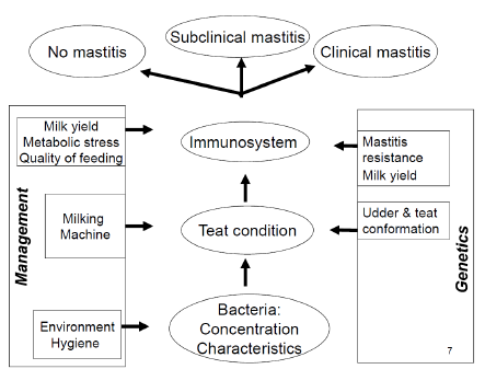 Immunsystem: Mælkeproduktion, metabolisk stress og kvalitet af foder spiller ind (management). Det samme gør mælkeproduktion og mastitis resistens (genetik)