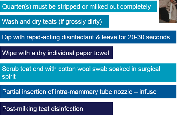 As part of the treatment for mastitis, explain the aseptic infusion techqniue for administration of intra-mammary therapy?