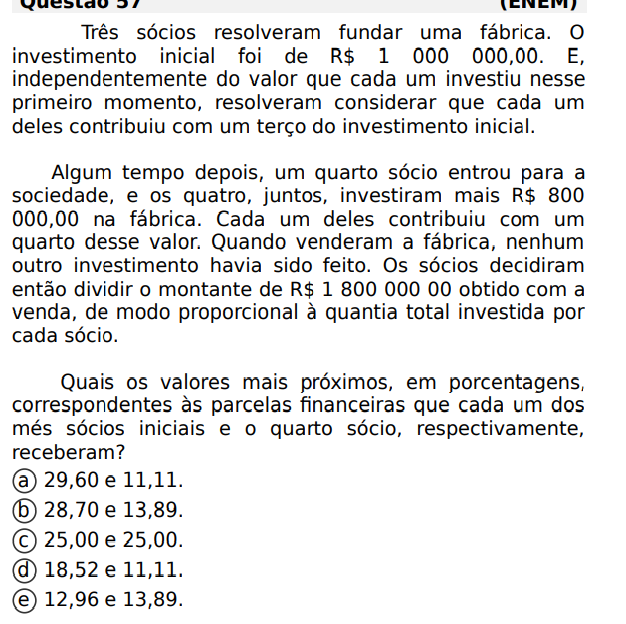 para os primeiros socios, calcula-se a porcentagem, somando os investimentos e fazendo uma regra de tres e pro quarto socio faz a regra de tres com o valor encontrado no segundo investimento