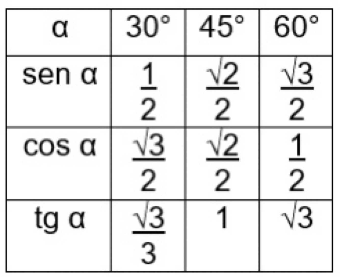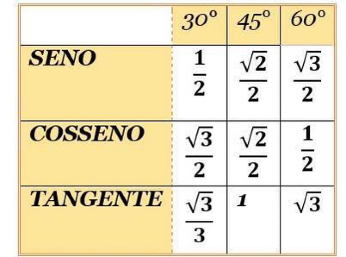 Quanto vale seno cosseno e tangente dos ângulos de 30° 45° e 60°?