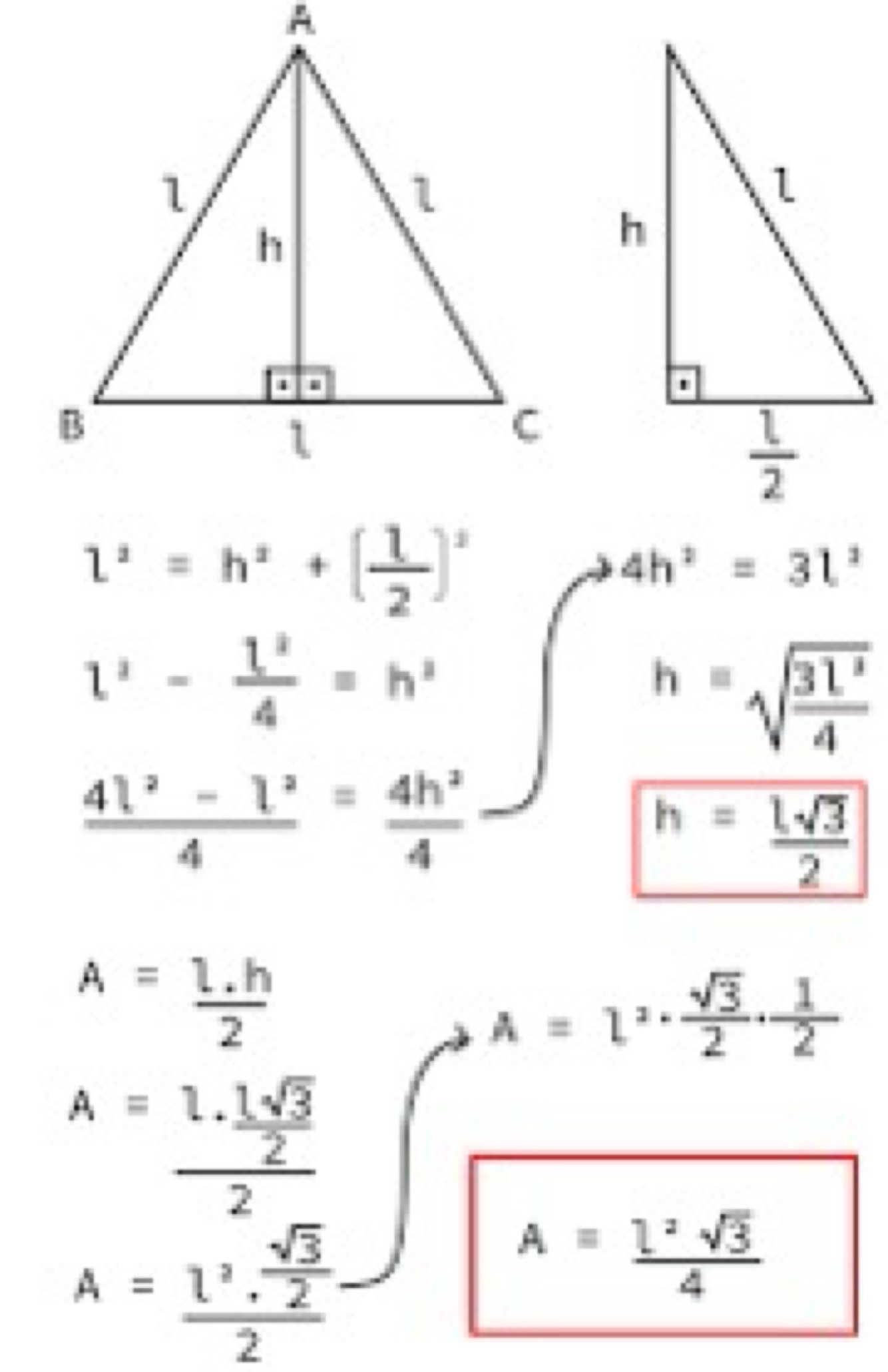 As fórmulas para calcular a altura e a área de um triângulo equilátero são: