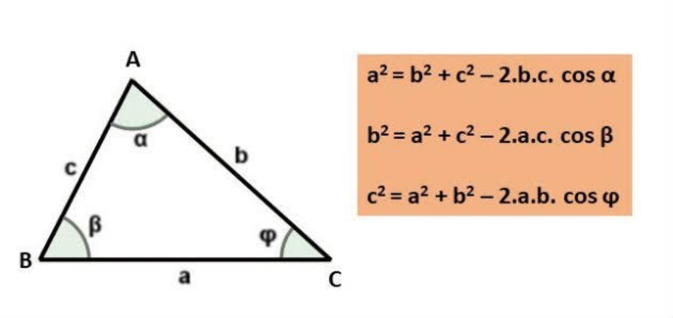 “Em qualquer triângulo, o quadrado de um dos lados corresponde à soma dos quadrados dos outros dois lados, menos o dobro do produto desses dois lados pelo cosseno do ângulo entre eles.”