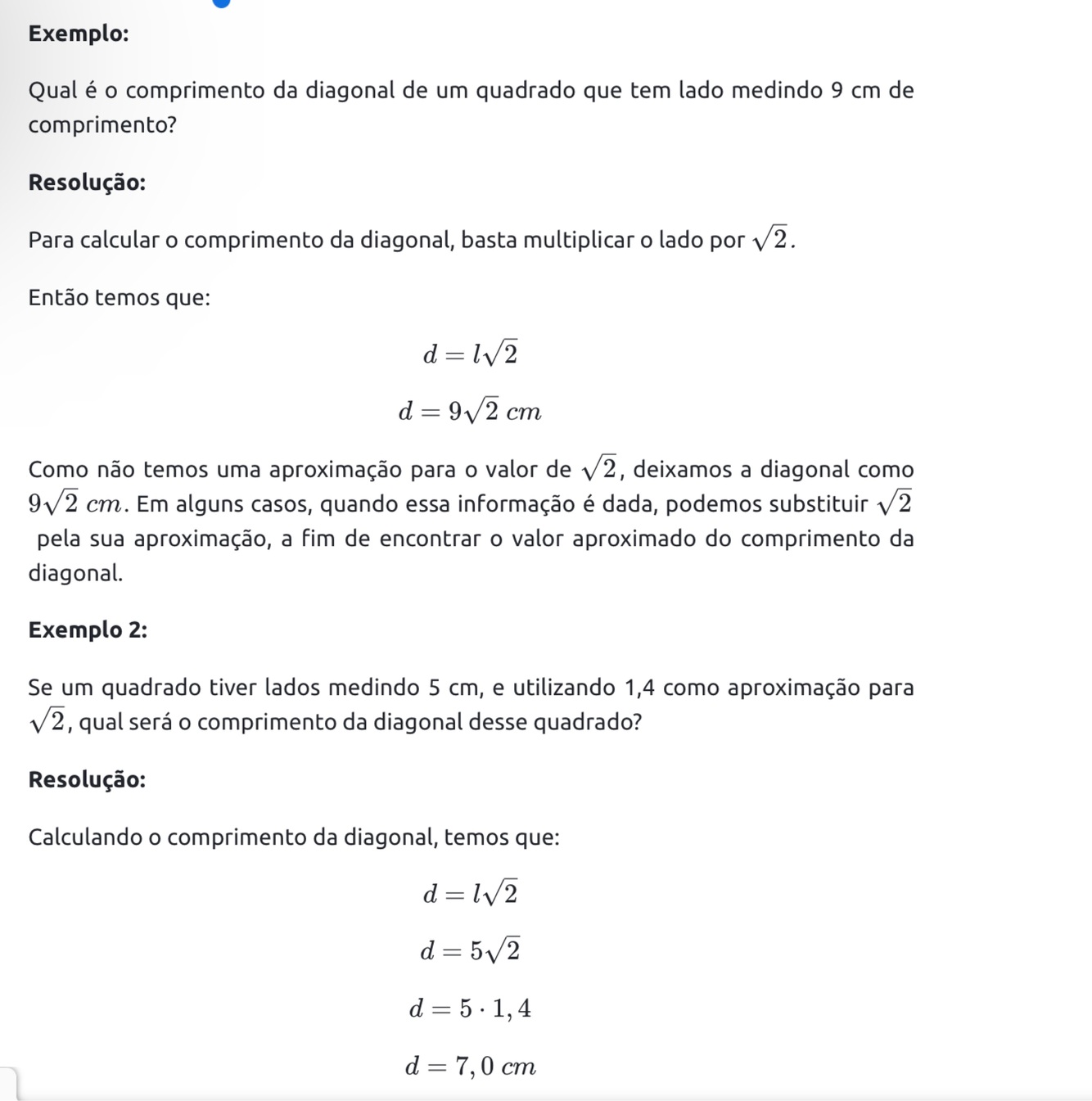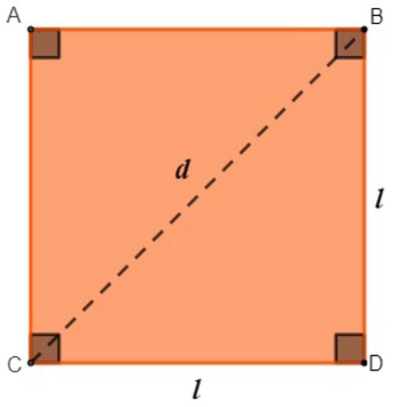 O quadrado possui duas diagonais, sendo que ambas têm a mesma medida de comprimento. Quando traçamos uma diagonal do quadrado, é possível perceber que ela o divide em dois triângulos retângulos: