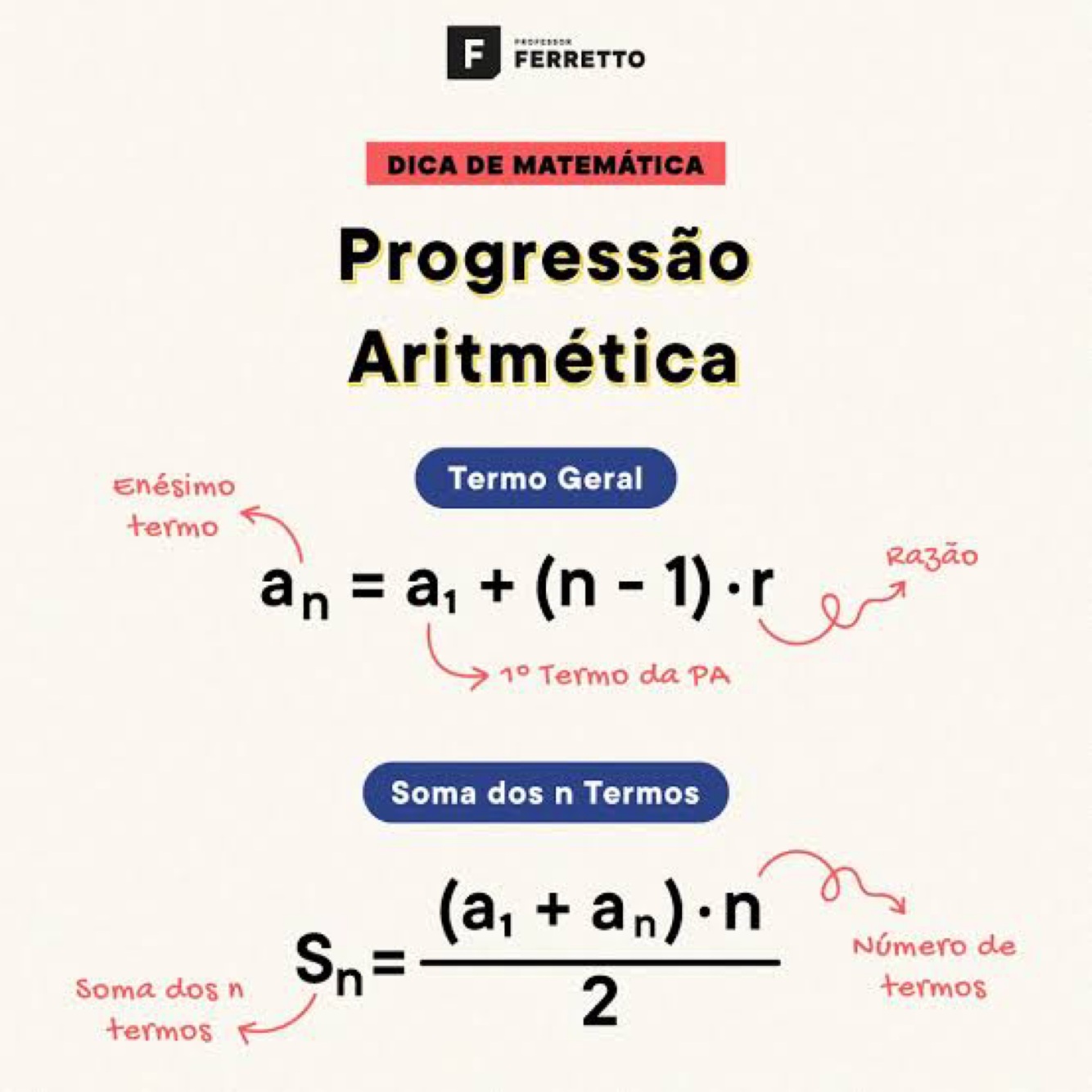 “Uma progressão aritmética (PA) é uma sequência numérica em que cada termo é a soma do anterior por uma constante, chamada de razão. Existem expressões matemáticas para determinar o termo de uma PA e para calcular a soma de seus n primeiros termos.,