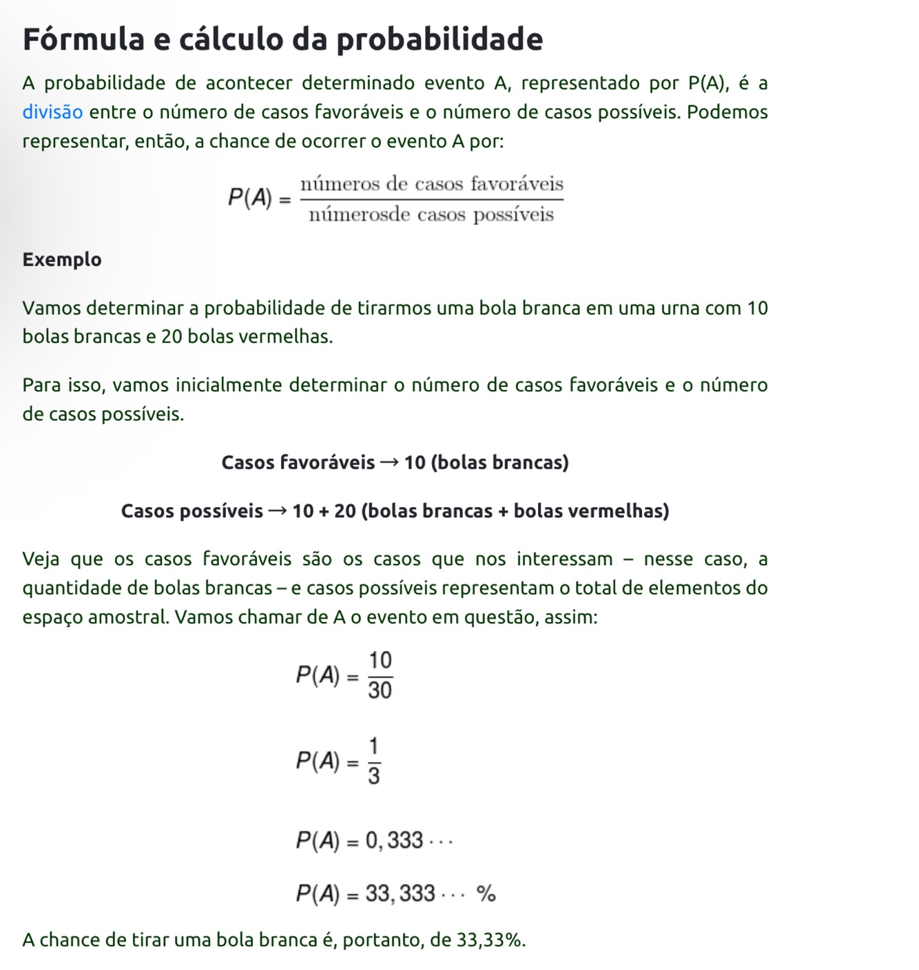 A probabilidade de acontecer determinado evento A, representado por P(A), é a divisão entre o número de casos favoráveis e o número de casos possíveis. Podemos representar, então, a chance de ocorrer o evento A por: