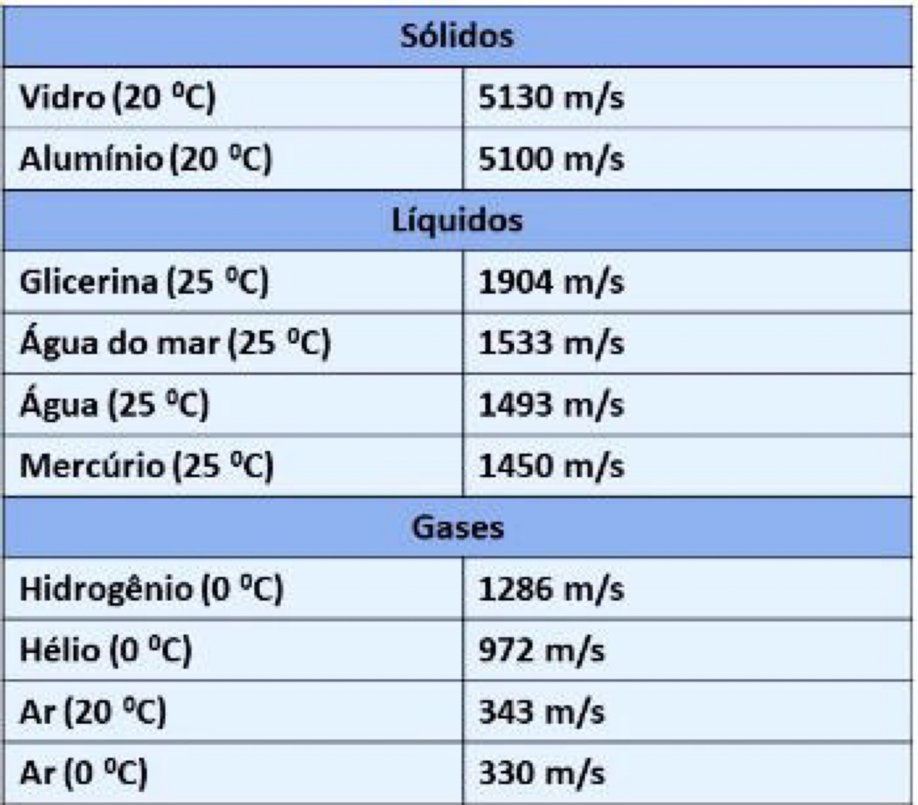 Já a velocidade do som na água, a uma temperatura de 20 ºC, é de 1450 m/s, o que corresponde a cerca de quatro vezes mais que no ar.