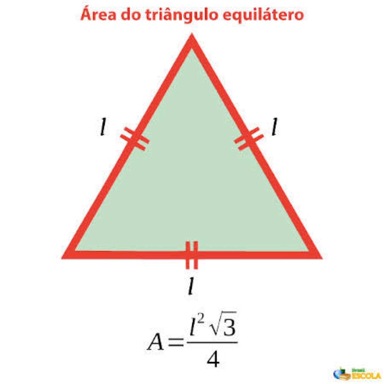 Para calcular a área do triângulo equilátero, multiplicamos o quadrado da medida do lado pela raiz de 3 dividido por 4