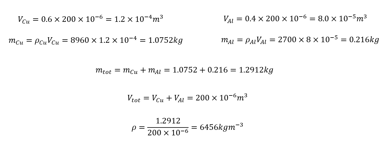 (Eg 200cm3 5kg rod of 60% copper (8960kgm-3) and 40% aluminum (2700kgm-3) by volume?)