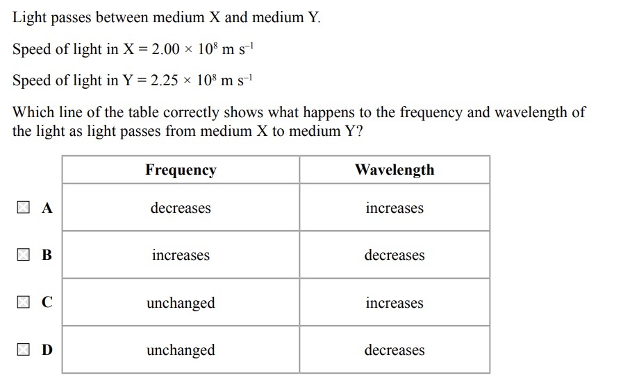 The frequency of light is directly related to its energy (as described by the Planck-Einstein relation E = hf, where E is energy, h is Planck’s constant, and f is frequency). If the frequency of light were to change upon entering a different medium, it would imply a change in the energy of the photons, which doesn’t happen in such transitions. The conservation of energy principle dictates that the energy (and hence frequency) of the photons remains constant.