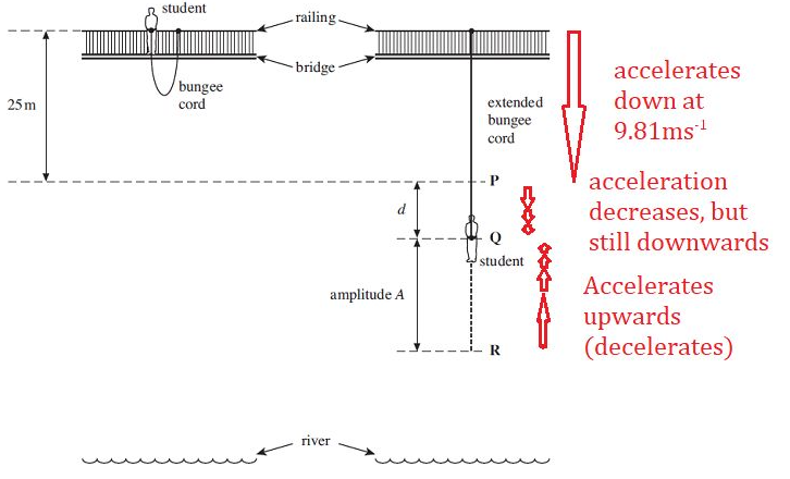 The resultant force on the jumper always acts downward until point Q so they accelerating downward until that point. Beyond point Q the resultant force acts upwards causing the speed of the bungee jumper to reduce.