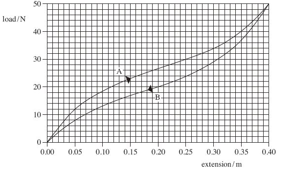 The graph below shows the extension of a rubber band as it is loaded and unloaded. What does it tell you about the work done done by the load when the rubber band extends compared to the work done by the rubber band as it returns to its orginal length?