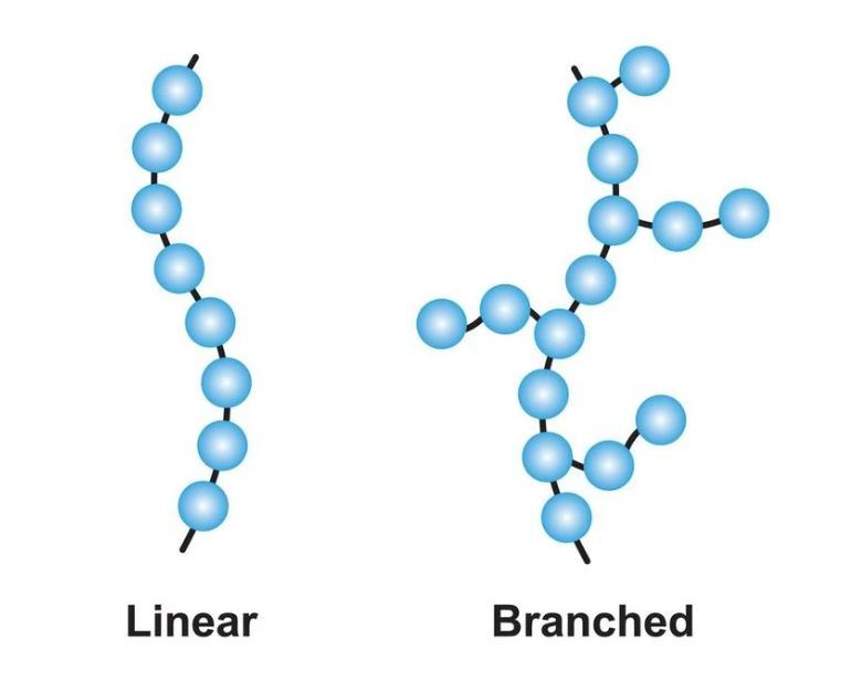 have a linear strcuture (long, straight chains of repeating units connected end-to-end) or branch structure (a main chain with various side chains or branches extending from it)