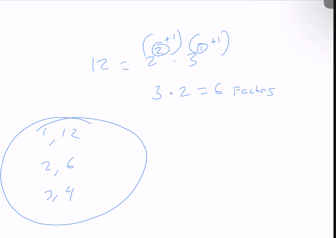 lets take a number 12 numbers are made up of prime factors every number has its unique set of prime factors what makes a number distinct, and in fact as we have discussed think about numbers not as numbers but as composites of their dna. governs every aspect of the that number, governs the entire identity of that number, it is also the case that numbers have a set of factor pairs factor pairs of 12, 1, 12, 2, 6, 3,4 - if you want to know how many factors that number has you can caluclate it using its prime factorization is using process on sheet so 12 2^2 x 3, circle exponents 2 and 1 we add 1 to each exponent then multiply the result 2+1=3 and 1+1= 2, 3x2 6 12 has 6 factors, 1, 12, 2, 6, 3, 4 and thats what it means