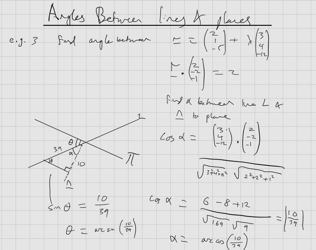 Use dot product on the direction of the line and the normal to the plane. Subtract the angle found from 90.