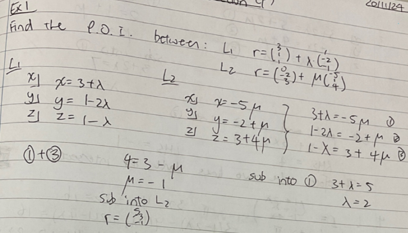 Set the general point on both line equal to a point (x,y,z) and solve for lambda and mu and for x,y,z to find POI
