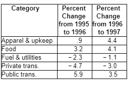 The table shows the percent change in a Consumer Price Index from the previous year for 1996 and 1997. Which category shows the greatest change from 1995 to 1996?