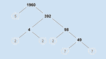 This is a factoring tree. It is one way that a student can perform the prime factorization of a number. In this instance, the number 1960 has been factored into the prime factorization 1960 = 2 × 2 × 2 × 5 × 7 × 7 = 2³ × 5¹ × 7².