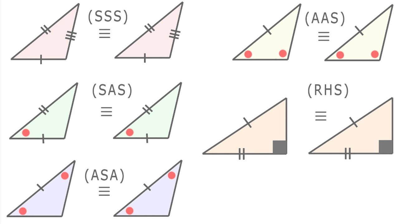 Angle/Side/Angle (ASA) : If two angles and the side between them of one triangle are congruent to the corresponding angles and side between them of another triangle, then the two triangles are congruent.