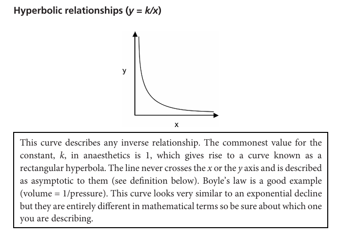 commonest value for k in anaesthetics is 1, which gives rise to a curve known as rectangular hyperbola, where the line never crosses the x or y axis (asymptotic to them)