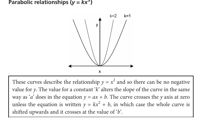 the value for k alters the slope of the curve in the same way that a does in the equation y=ax +b. The curve crosses the y a 0 unless written y=kx^2 +b in which case the whole curve is shifted upwards and crosses at the value of b