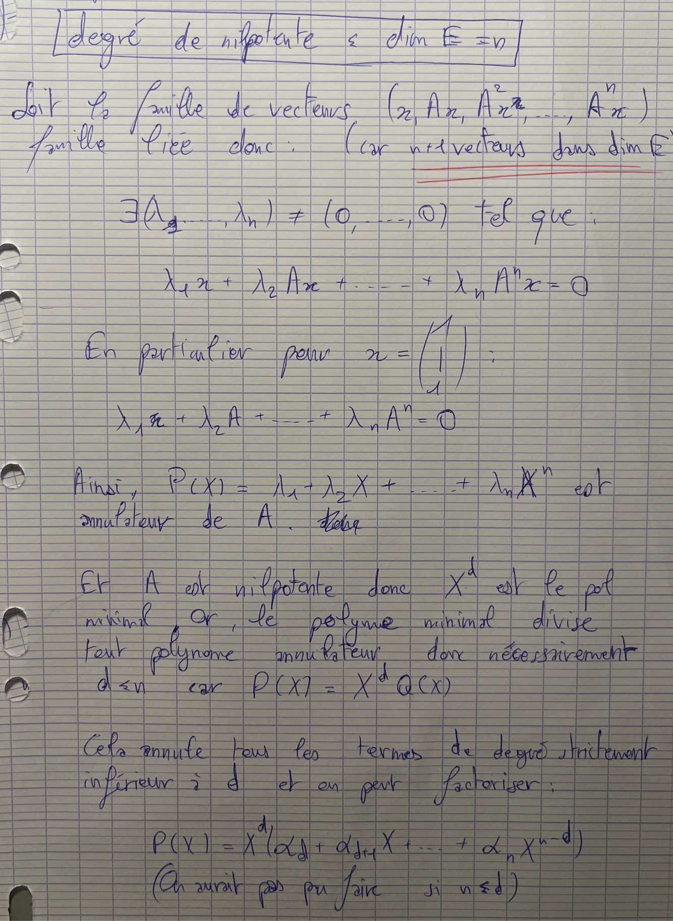 Montre que le degré de nilpotence d’une matrice est inférieur à la dimension de l’espace