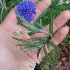 Blue sapphire colour cornflower, true wildflower. It has tough stems and so used to be called ‘Bluntsickle’. Long thin leaves with a silver hairiness to them.