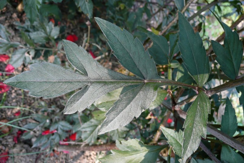 Dark stems, the leaf has as flat margin then splits in to a serrated edge.