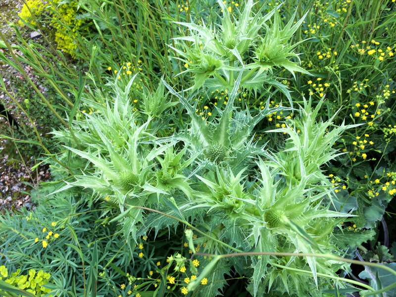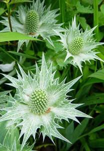 Cone shaped flower in white- usually purple- the petals drop back and down like tutu, the cone is stiff and prickly- echina/ hedgehog
