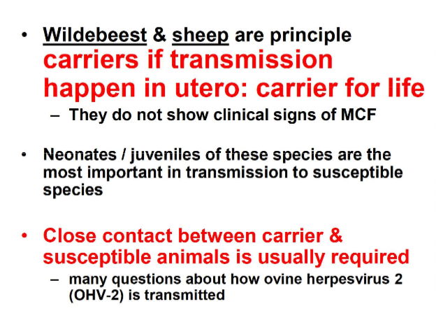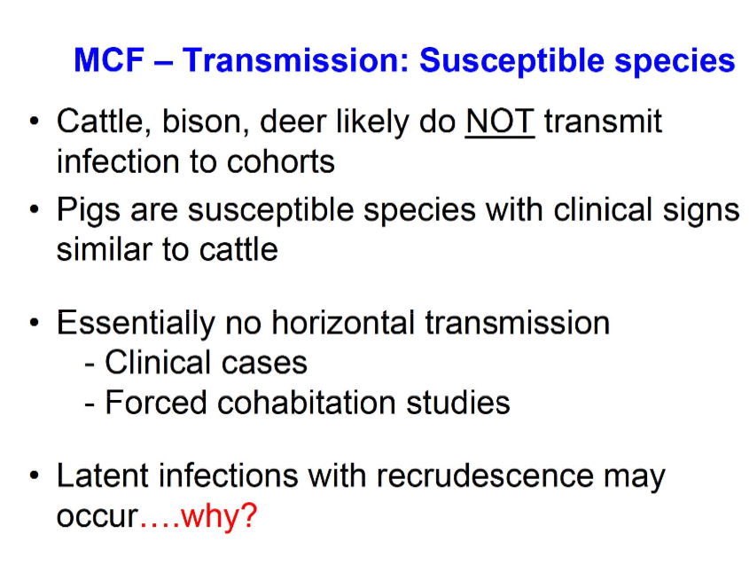 How is MCF transmitted in susceptible species?
