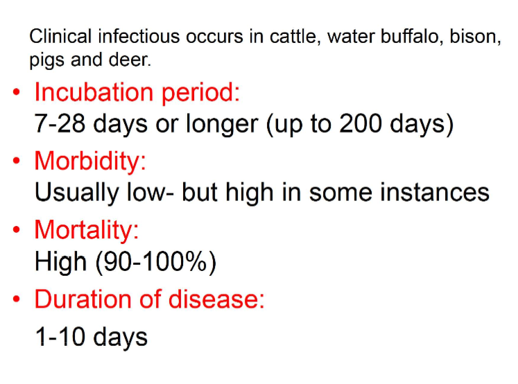 What is the Incubation period, morbidity, mortality and duration of MCF?