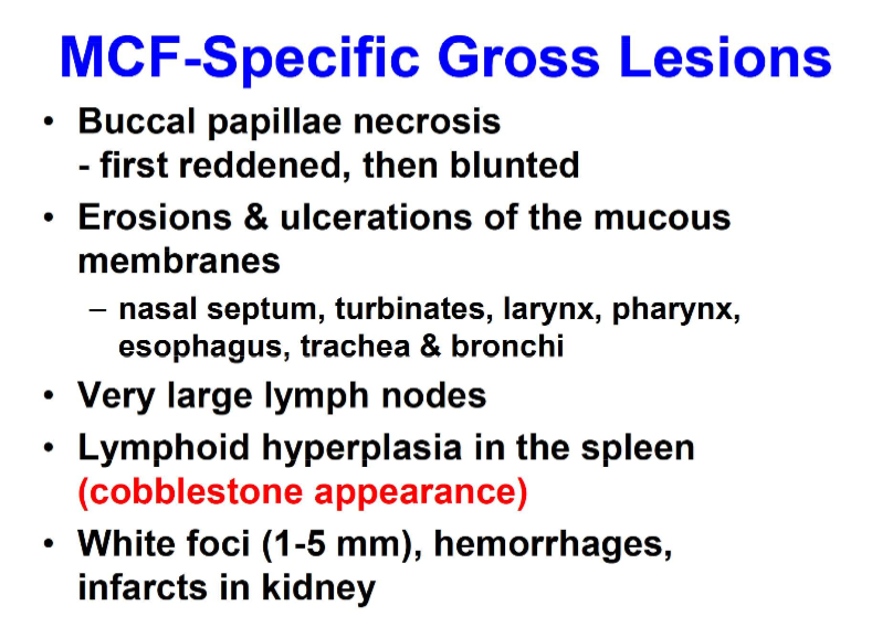 What gross lesions are common to MCF