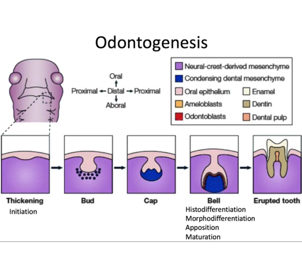 Dental Papilla: odontoblasts -> dentin; central cells-> pulp