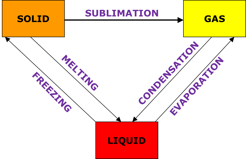 Describe the phase changes between solid,liquids, gases.