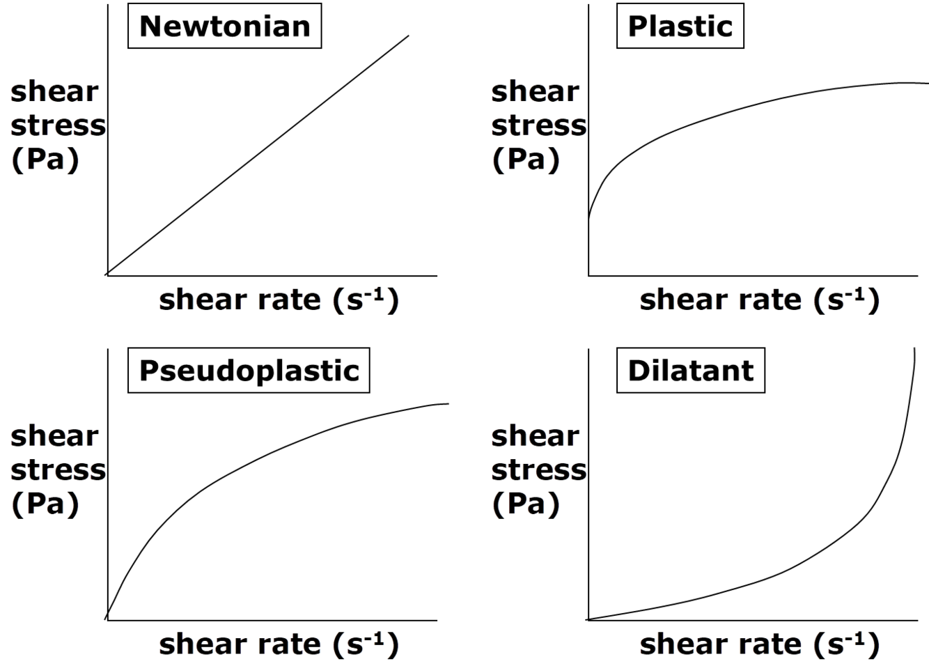What are examples of newtonian, plastic, pseudoplastic and dilant flows?