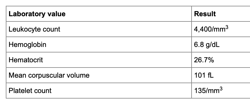 This elderly patient presents after a fall due to dizziness in the context of chronic fatigue and weakness. Bloodwork reveals pancytopenia (i.e. macrocytic anemia, leukopenia, and thrombocytopenia) consistent with myelodysplastic syndrome (MDS). In the acute setting, packed red blood transfusion should be considered for significant anemia (hemoglobin levels < 7 to 8 g/dL) as well as for persistent symptoms following fluid resuscitation and for patients with underlying cardiovascular disease.