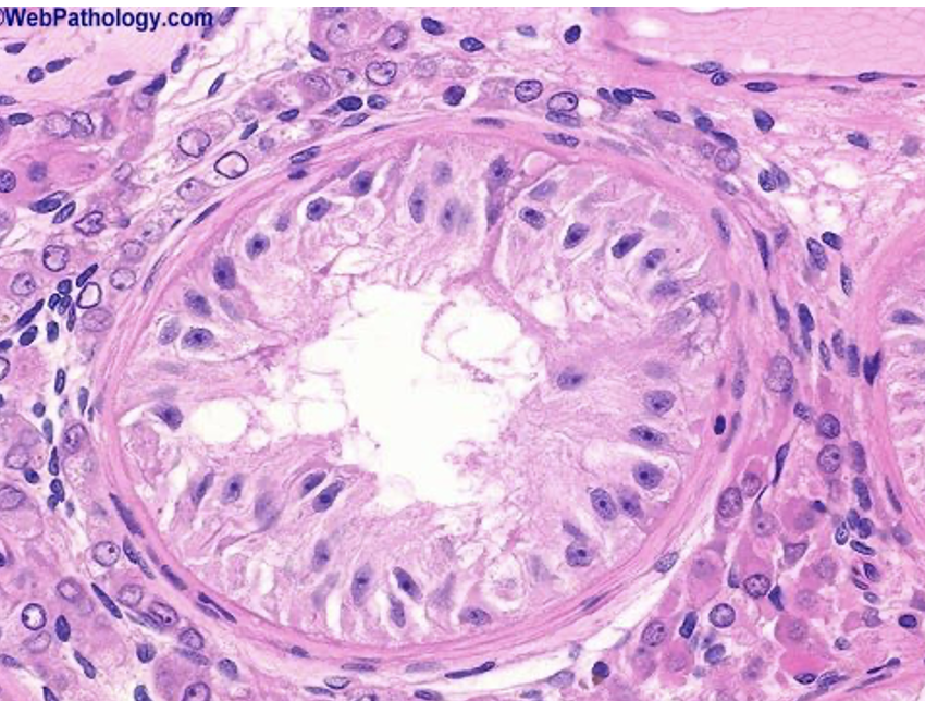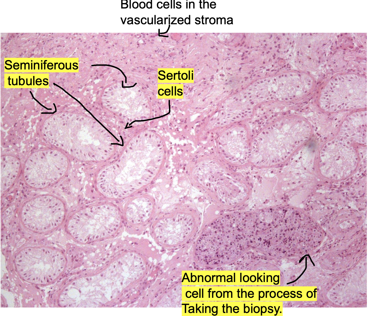 -You can see the Leydig cells surrounding the seminiferous tubules but it is more sparse because there is a little bit of oedema fluid surrounding the outside of the seminiferous tubule and this also might be caused by the process of taking the biopsy.