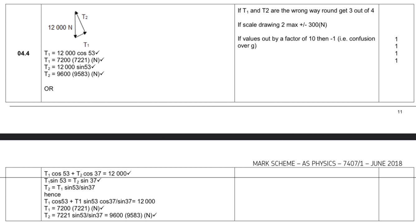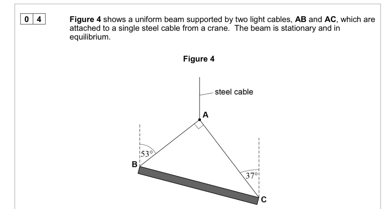 Weight of the beam is 12,000N. Calculate Tension in AB (T1) and Tension in AC (T2)