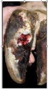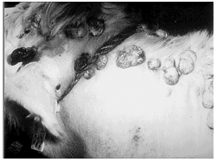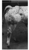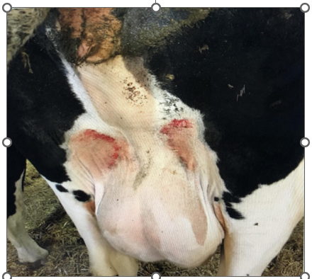 Vous voyez plusieurs vaches laitières en stabulation entravée qui présentent ce genre de lésions (voir photo ci-dessous). Parmi les choix suivants, quel serait votre diagnostic? (2022-2021-2020)