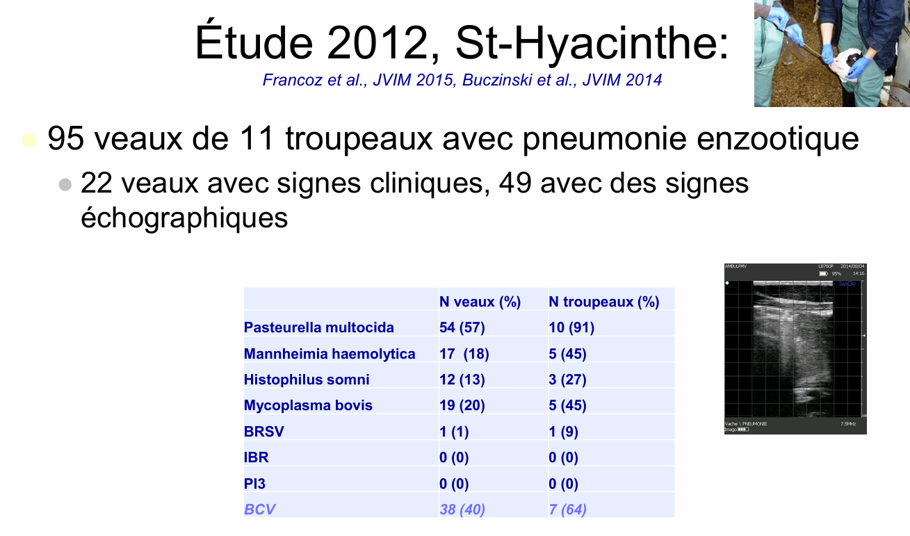 Vous évaluez un problème de pneumonie enzootique vraisemblablement bactérien chez des génisses dans une ferme laitière. Le producteur vous mentionne que généralement, les années passées il utilisait le ceftiofur comme premier traitement, mais que son taux de réussite est très faible. Lors de visite vous voyez un veau qui n’a pas encore été traité et qui boite avec une distension du carpe. Un autre veau a également la tête penchée.