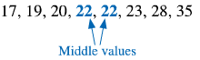 Divide the number of values by 2. This number and the number after it are the middle two values.