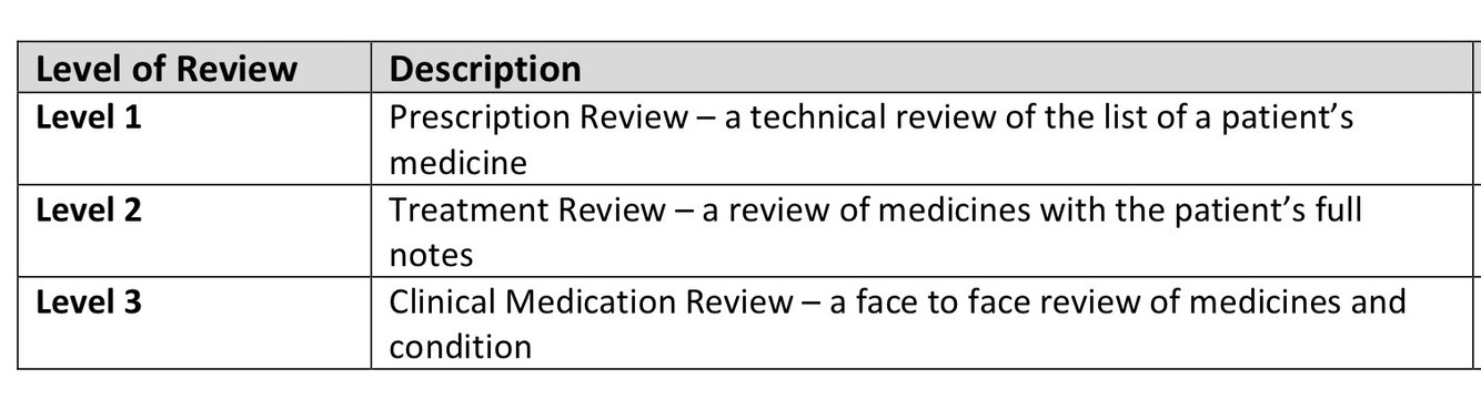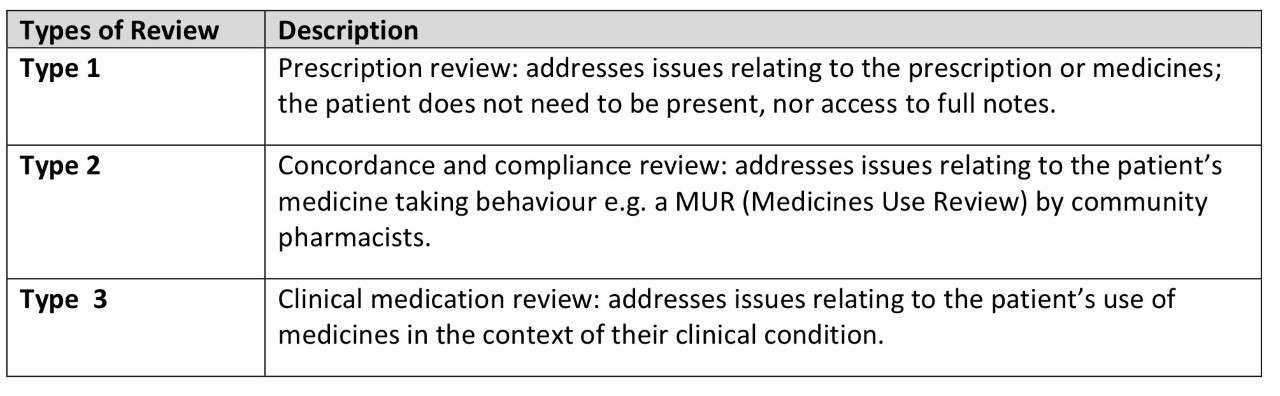 “A structured, critical examination of a person’s medicines with the objective of reaching an agreement with that person about treatment, optimising the impact of medicines, minimising the number of medication-related problems and reducing waste.” NICE 2015