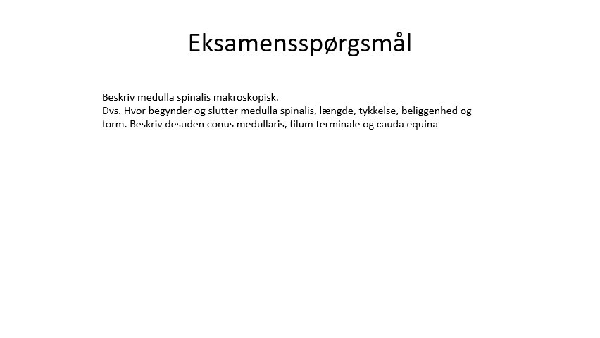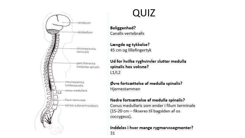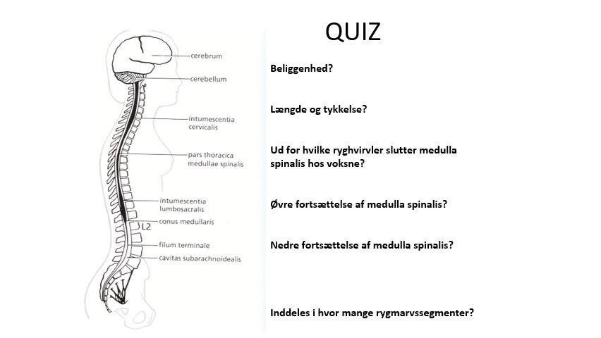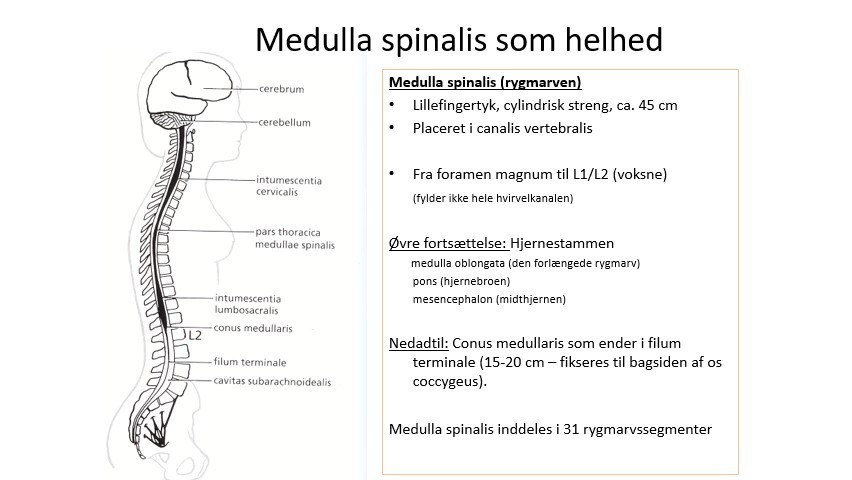 Medulla spinalis begynder ved forarmen magnum og går til overgangen mellem L-1 & L-2 - Den er 45 cm lang og ca. en lillefingers tyk ( 1 cm i diameter), Den ligger i Canalis vertebralis og cylindrisk form.