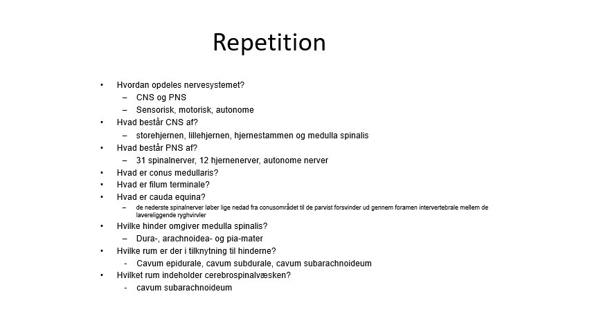 Cauda equina - er nervetråde fra medulla spinalis, som første forlader canalis vertebralis nede ved slut lumbalt/sacralt niveau. - Den så kaldte hestehale.