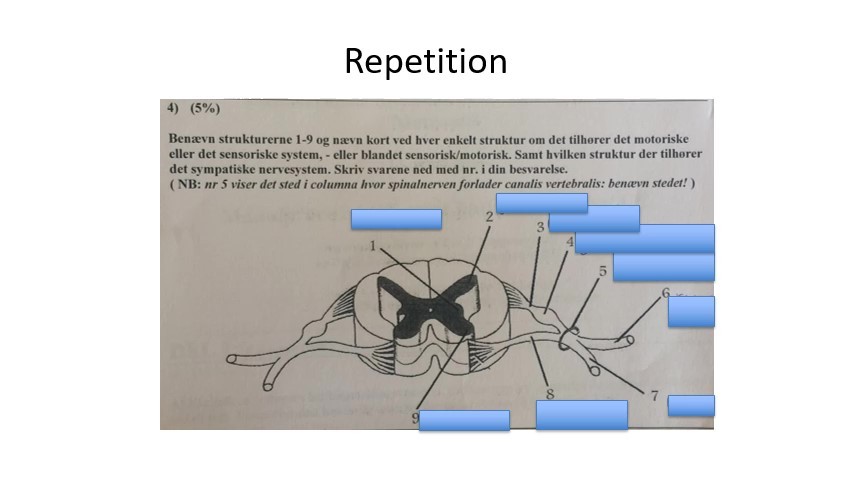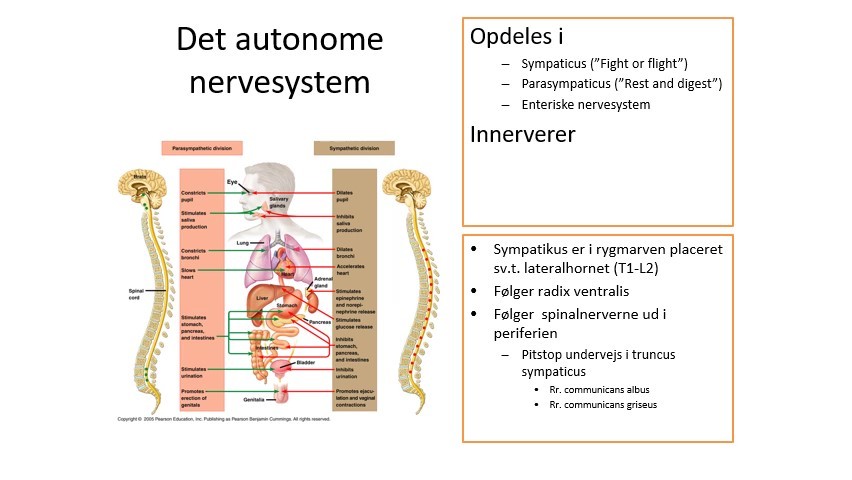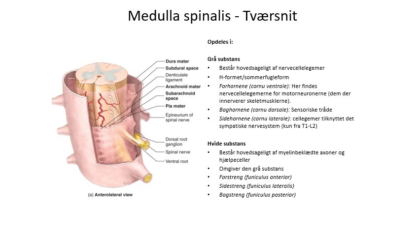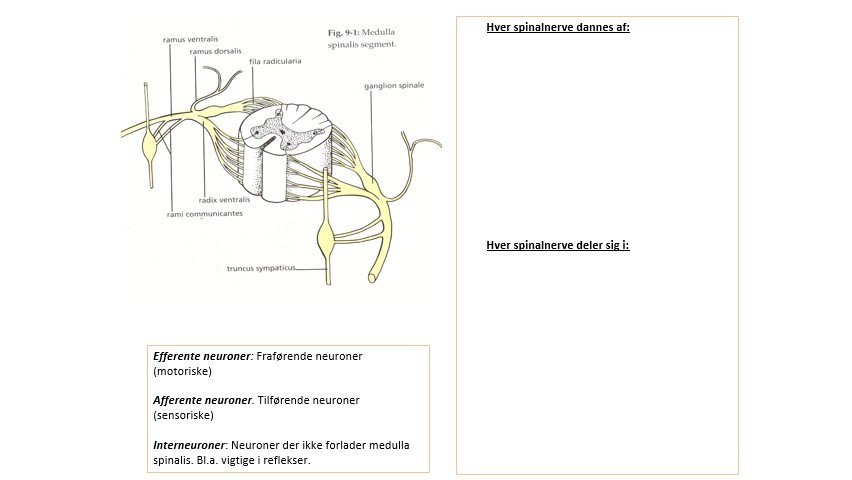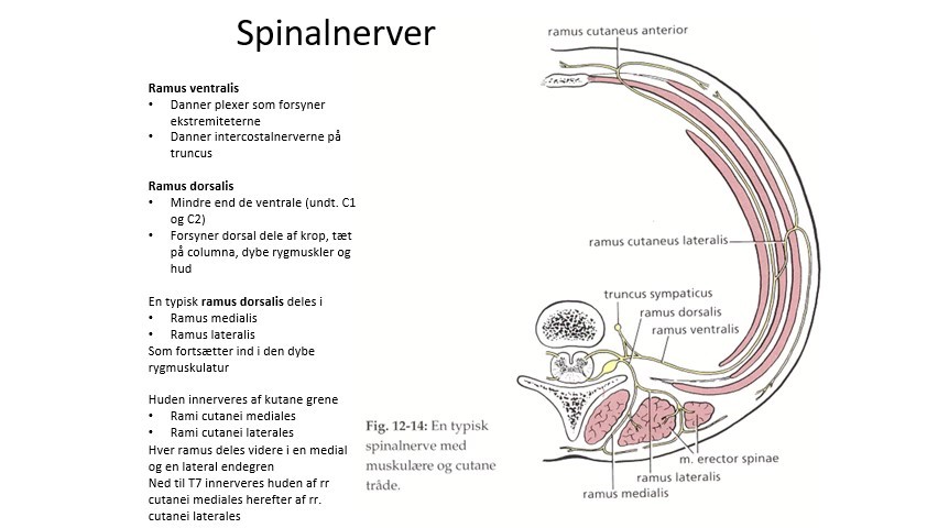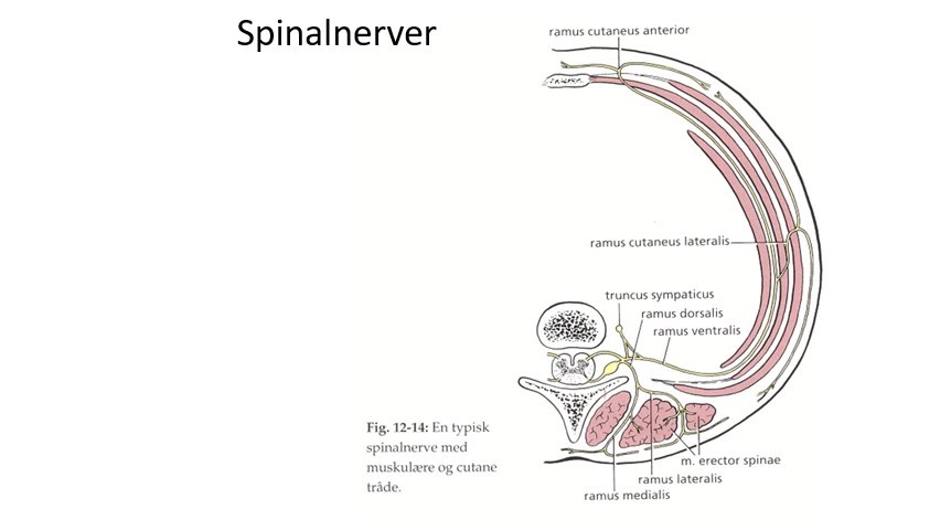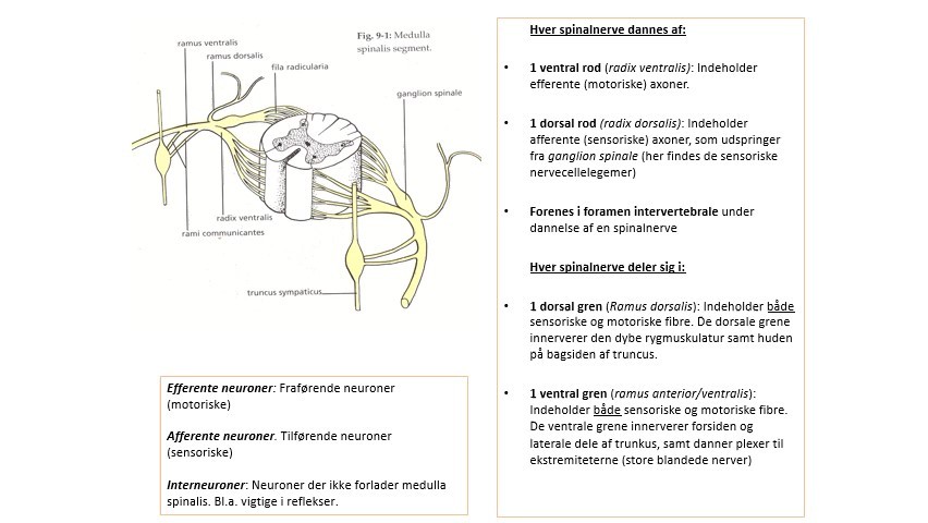 B - En spinalnerve dannes når radix ventralis og radix dorsalis løber sammen, og de indeholder motorisk, sensorisk og sympatiske nervetråde.