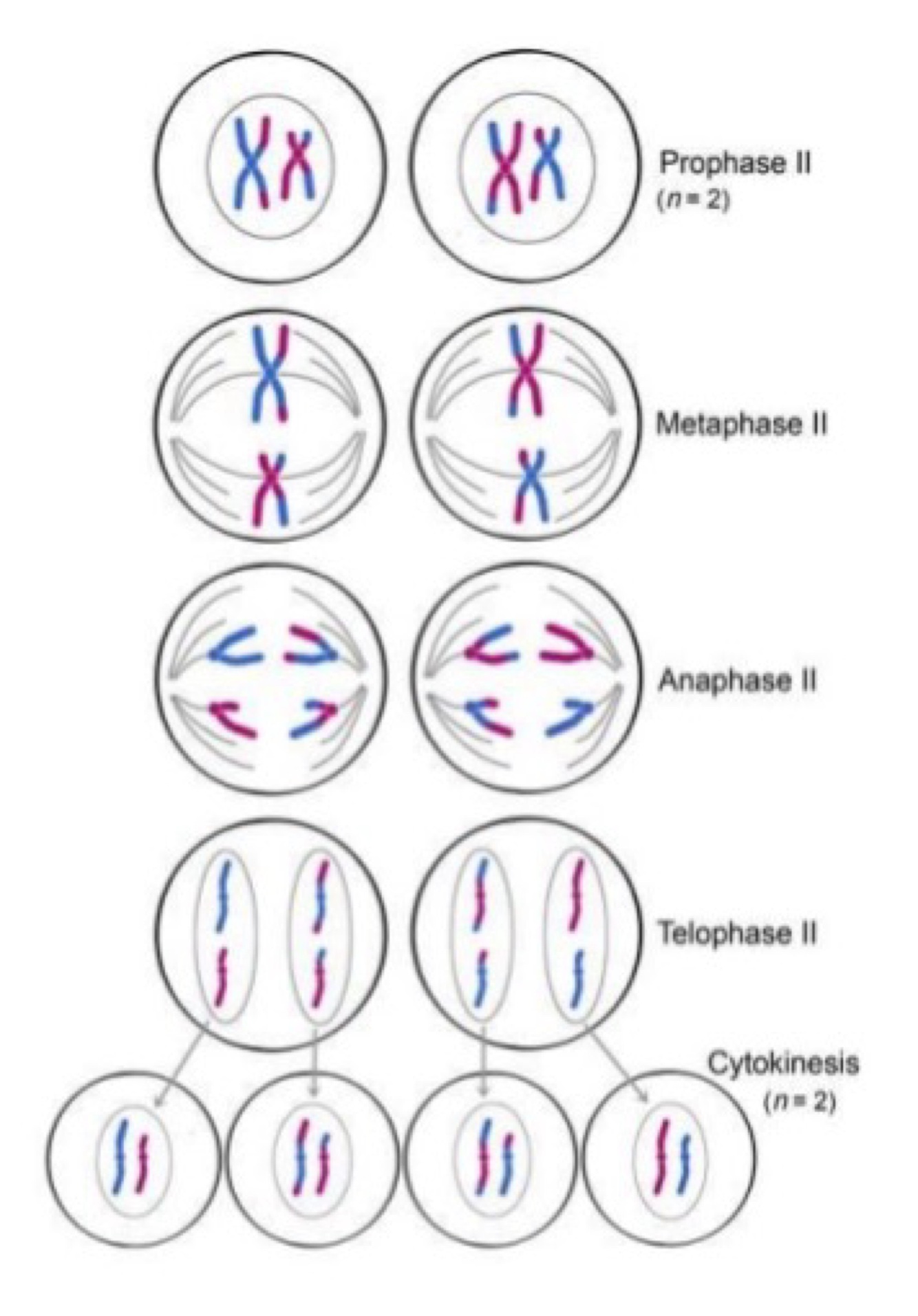 I meios II separeras systerkromatider, på ett sätt som liknar mitos men resulterar i 4 haploida enkla kromosomer