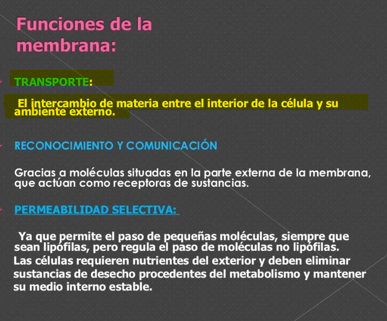 Uma das funções da membrana plasmática é o TRANSPORTE na qual faz a troca de matérial entre o interior da célula e seu ambiente __________