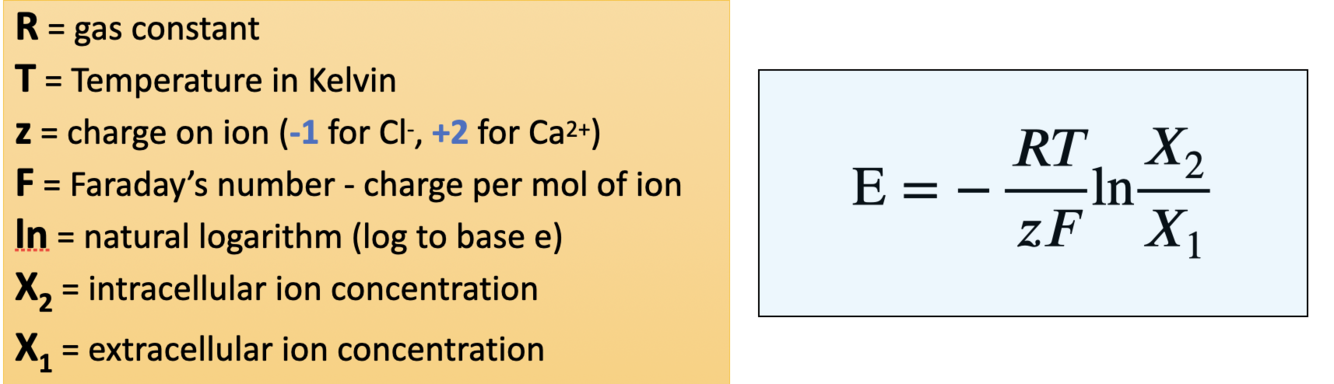 Used to calculate equilibrium potential using temp and ion concentrations