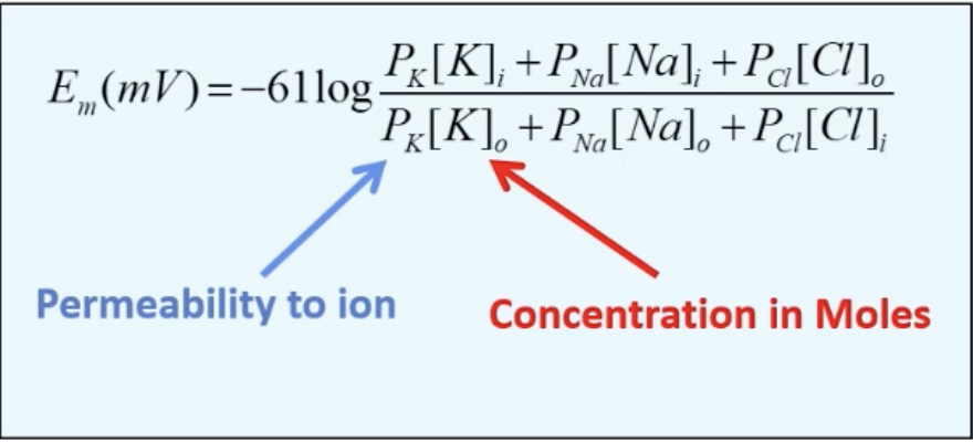 The GHK equation describes the membrane potential (Em) using ion permeability and concentration more accurately; P is permeability or channel open probability (0 = 100% closed, 1 = 100% open, 0.5 = open 50% of time), Subscript on P indicates the ion,