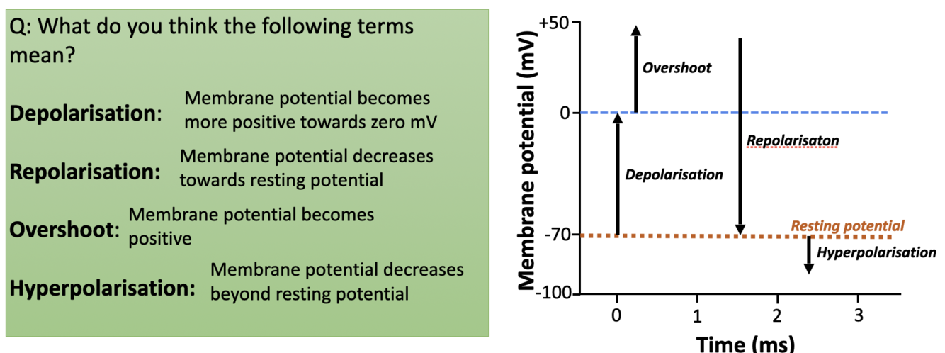What does depolarisation, repolarisation, overshoot and hyperpolarisation mean?