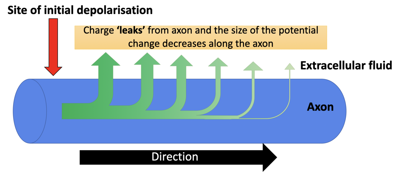 How does the size of an action potential change as it travels along an axon and why?